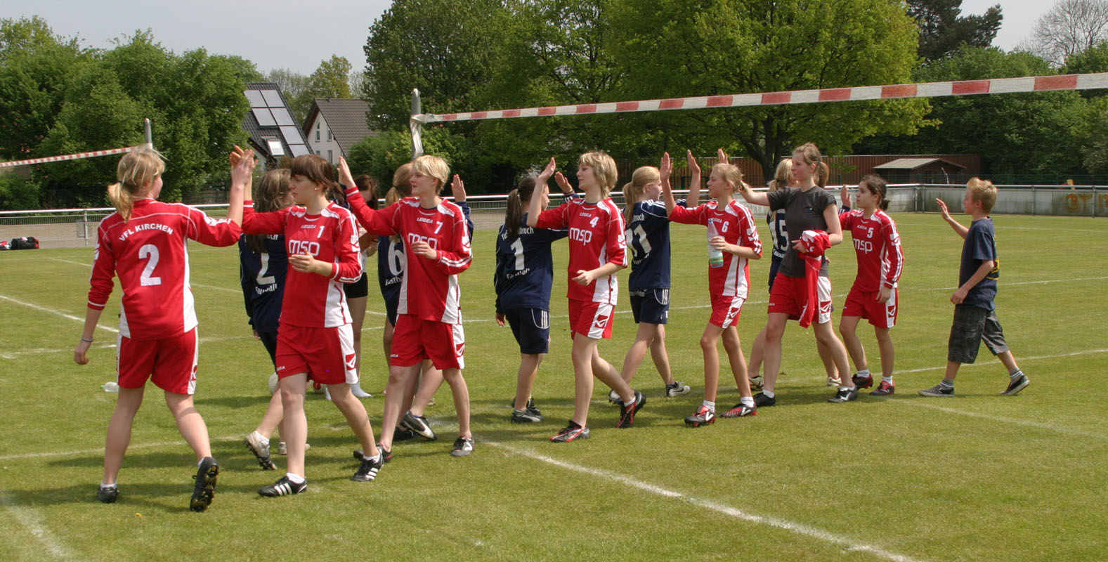 v.l.: (Kirchen in roten Trikots) Josefine Pfeifer, Laureen Nievel, Laura Ruppelt, Jacqueline Böll, Paulina Pfeifer, Kristin Cremer, Theresa Halbe, Robert Pfeifer