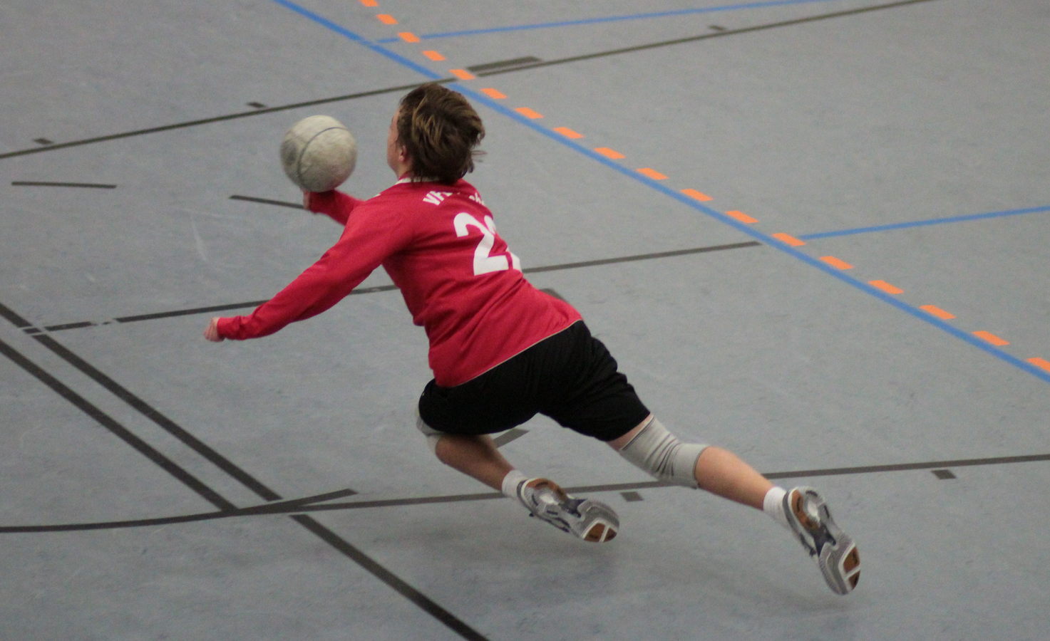 VfL-Angreifer Robin Schuh holt noch fliegend den Ball