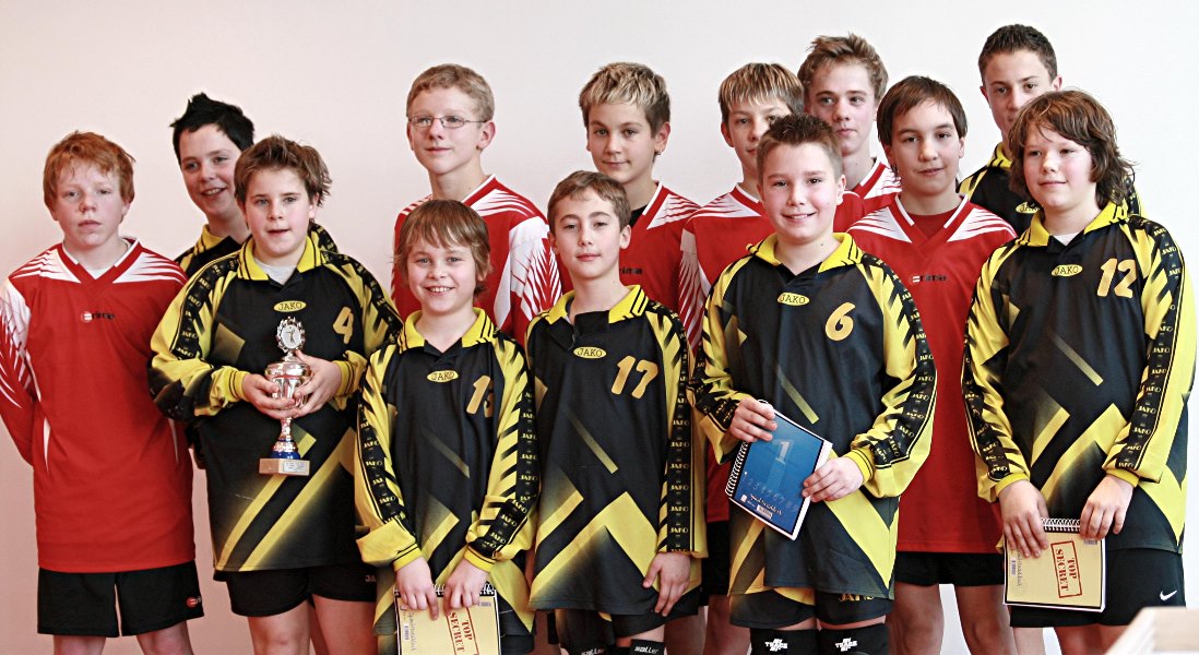 Mannschaftsfoto des Erst- (TV Waibstadt, schwarze Trikots) und Zweitplatzierten (VfL Kirchen, rote Trikots)