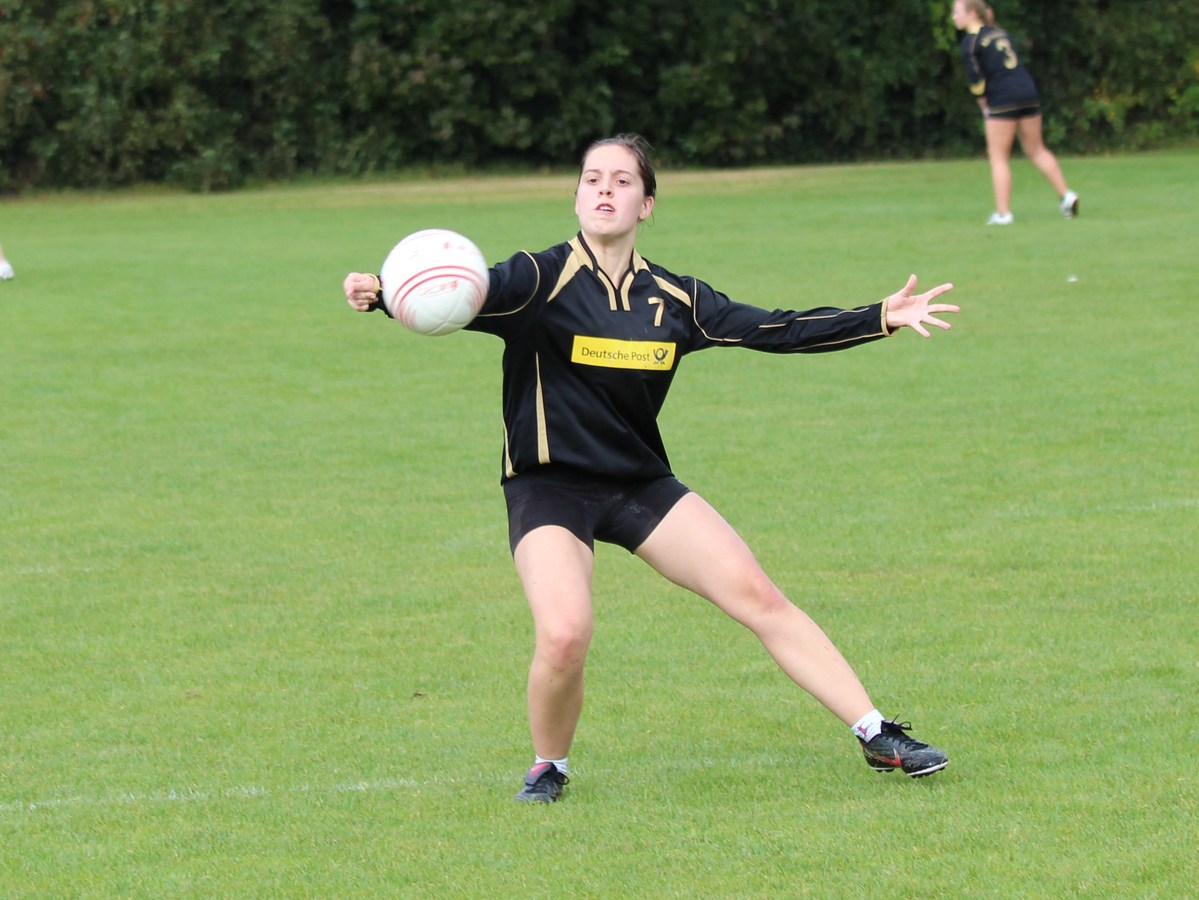 Theresa Halbe wehrt auf dem nassen Rasen gekonnt den Ball ab