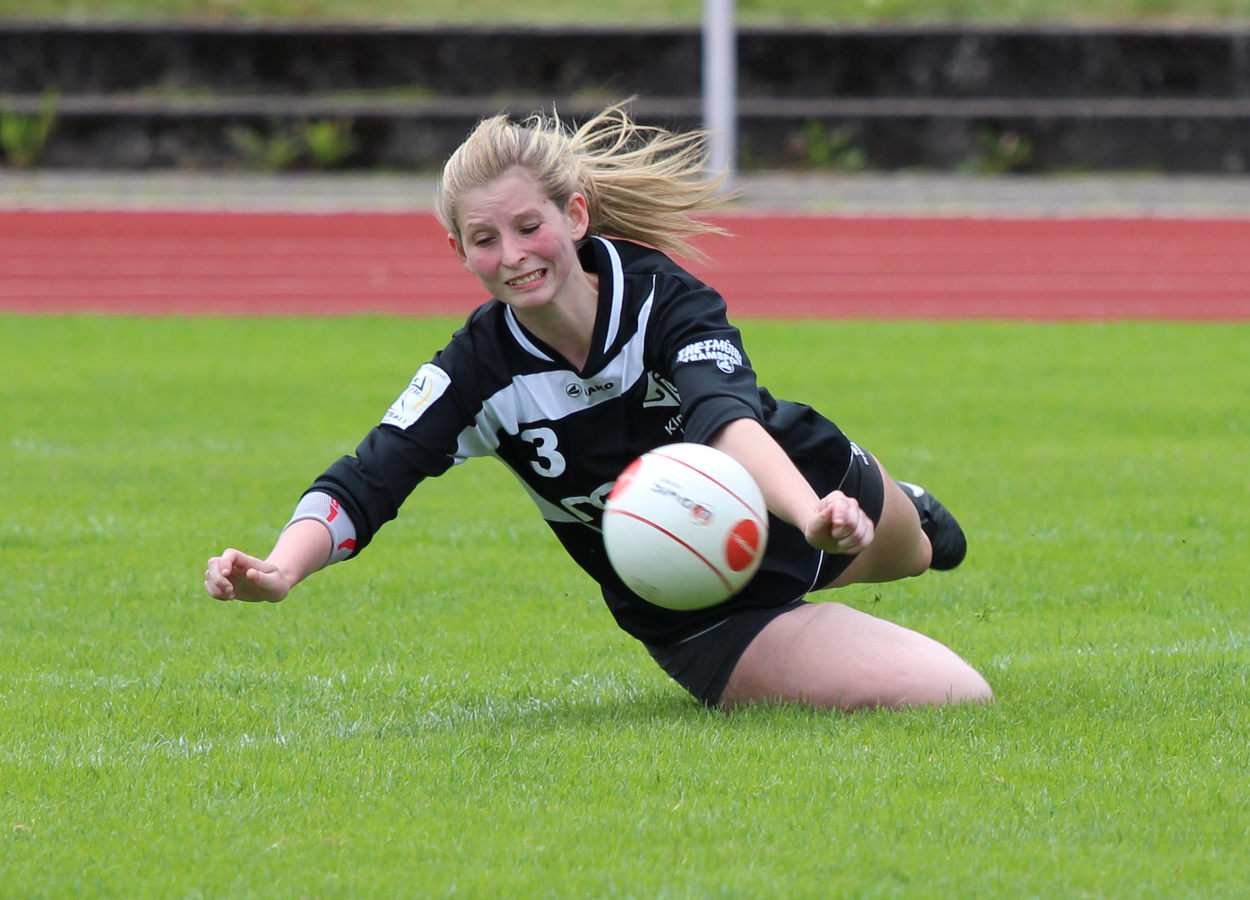 Die VfL Mittelfrau erreicht einen Ball knapp über der Grasnarbe