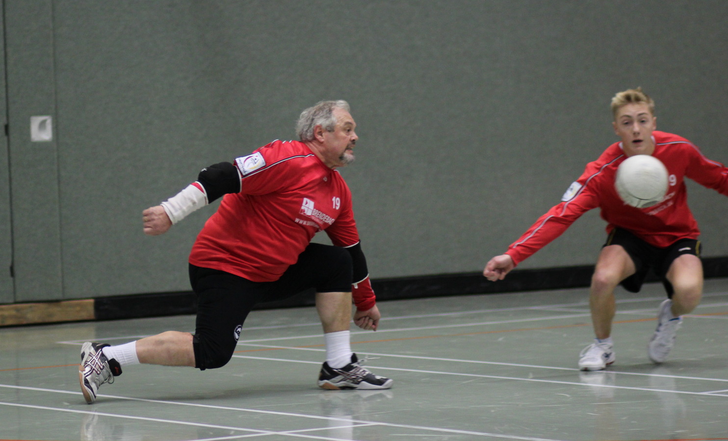 Robert Pfeifer erreicht den Ball bevor er das zweite mal den Boden berührt und wird von Manfredo Treswko gesichert